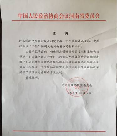 近日,必赢官网应用性科研成果又传喜讯。由马克思主义学院(中原农村发展研究中心)研究人员撰写的咨政报告《农村土地确权登记中的法律问题与对策》被河南省政协选中后,作为专题发言提案参加了全国政协和国务院共同召开的双周协商座谈会。根据全国政协的文件精神,座谈会成果将及时向中共中央、国务院及有关部门反映。采用证明内容如下:“由农村发展研究中心马洪伟、喻琳撰写的《农村土地确权登记中的法律问题与对策》被全国政协双周协商会采用为大会发言,为国家和省制定或修订相关法律法规和政策提供了极具参考作用的的意见建议。”